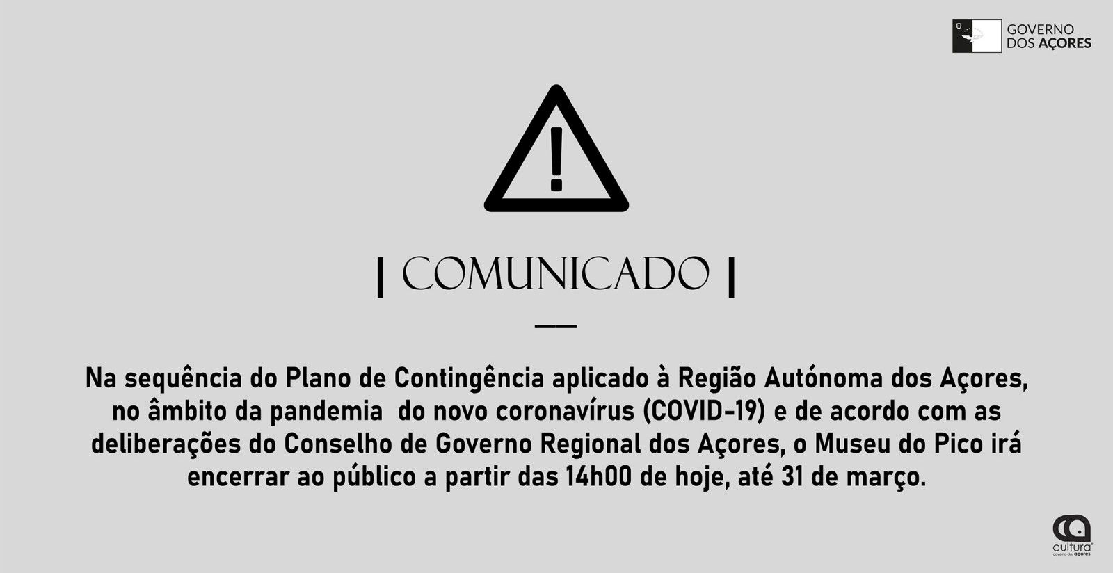 Na sequência do Plano de Contingência aplicado à Região Autónoma dos Açores, no âmbito da pandemia do novo coronavírus (COVID-19) e de acordo com as deliberações do Conselho de Governo Regional dos Açores, o Museu do Pico irá encerrar a partir das 14h00 de hoje, até 31 de março.