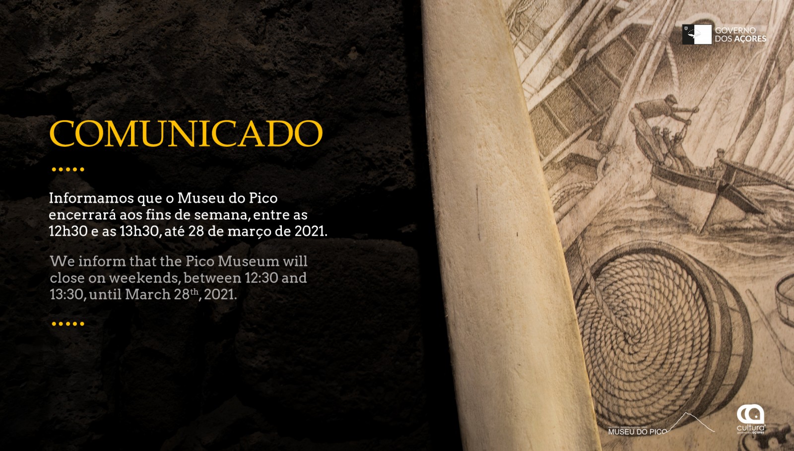 Informamos que o Museu do Pico encerrará aos fins de semana, entre as 12h30 e as 13h30, até 28 de março de 2021.
