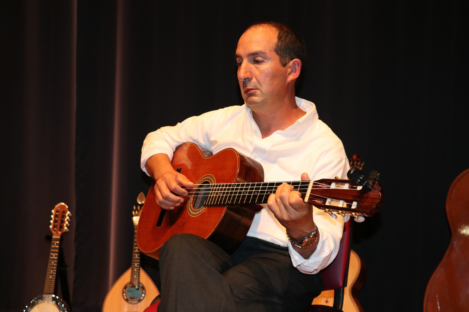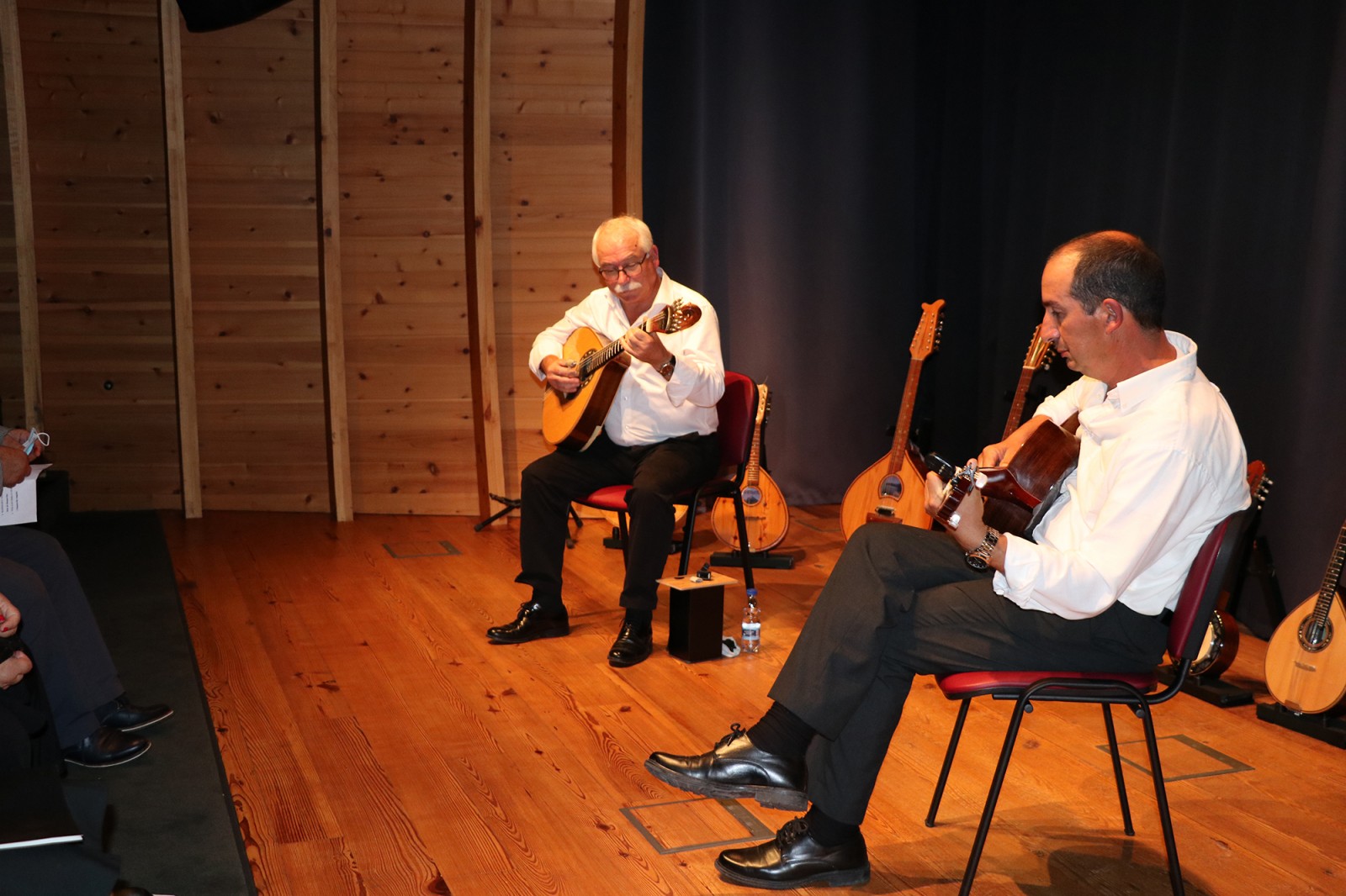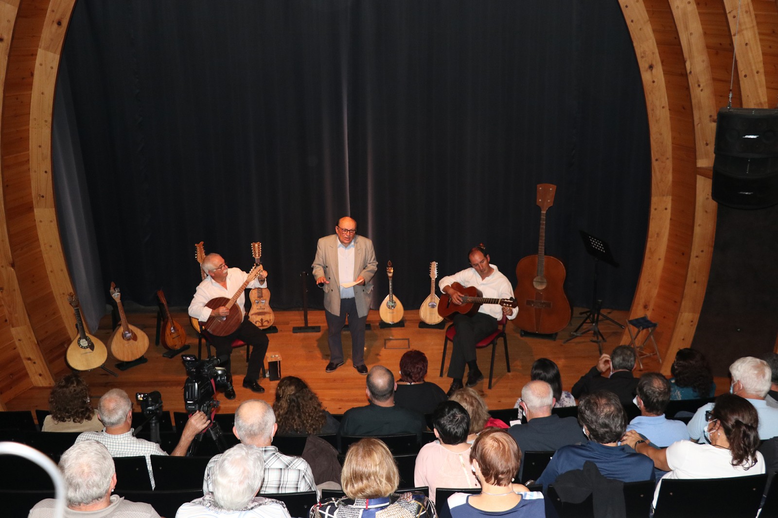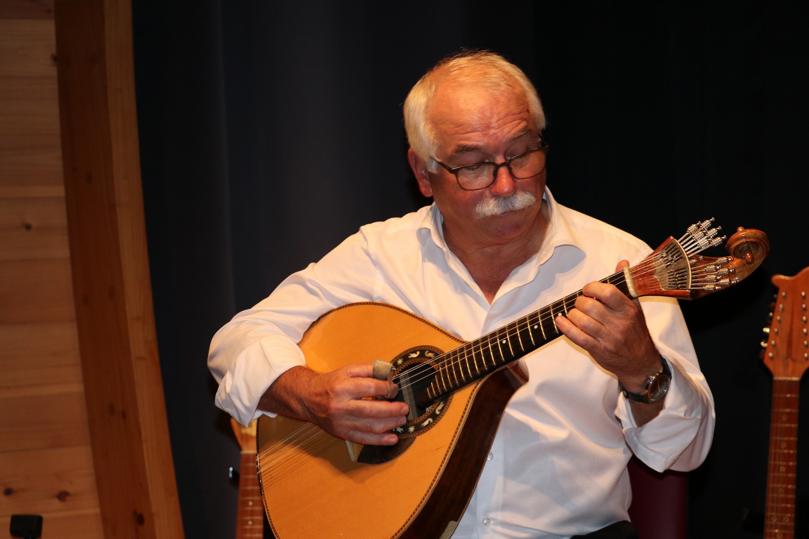 Laurindo Cardoso, carpinteiro reformado, também é construtor de instrumentos. “Carpinteiro dá para muitas coisas,” admite com um sorriso, “uns dias eram janelas, outros dias eram instrumentos.” Foi em 1985 que construiu o seu primeiro instrumento de cordas, um bandolim, que sobe ao palco para tocar um passo-dobrado. Mas também a bandola, o sexto instrumento que constrói, depois de uma guitarra, com um formato diferente, uma viola da terra, uma guitarra portuguesa e ainda um novo bandolim. “Desta vez vai tudo ao palco, só com um cheirinho de cada instrumento, porque também levo instrumentos que fui adquirindo durante os anos, como um banjo bandolim.”
