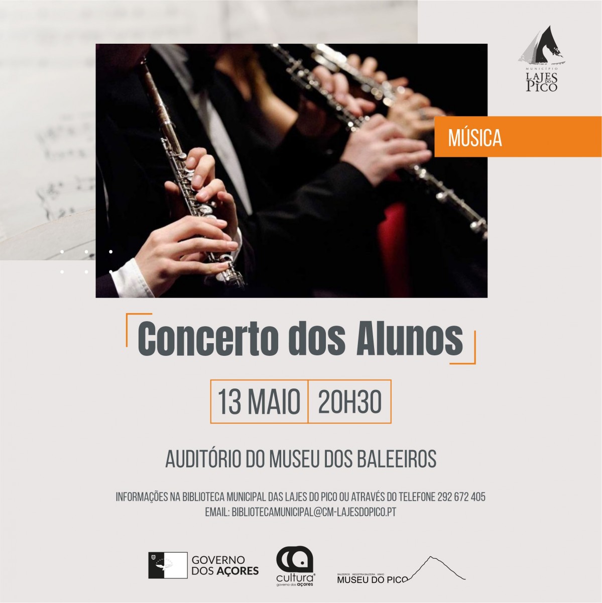 Depois da série “Concerto dos Professores”, e procurando a partilha de experiências que envolvam alunos e professores, numa perspetiva de desenvolver o gosto pela música, a Câmara Municipal das Lajes do Pico, em parceria com o Museu do Pico, apresenta no Auditório do Museu dos Baleeiros, no próximo dia 13 de maio, pelas 20H30, o “Concerto dos Alunos”.