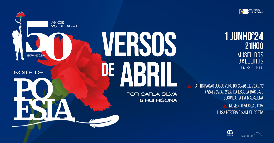 "Versos de Abril" trará no dia 1 de junho, sábado, ao Museu dos Baleeiros, nas Lajes do Pico, alguns poemas que marcaram a revolução. Foram muitos os poetas, homens e mulheres, que escreveram e marcaram o período pré e pós 25 de Abril. Criadores de textos poéticos carregados de símbolos e ideais que foram um contributo para que pudesse existir um Portugal sem censura, em plena democracia e liberdade. Carla Silva e Rui Risona interpretarão a temática, declamando e dando vida a essas criações.