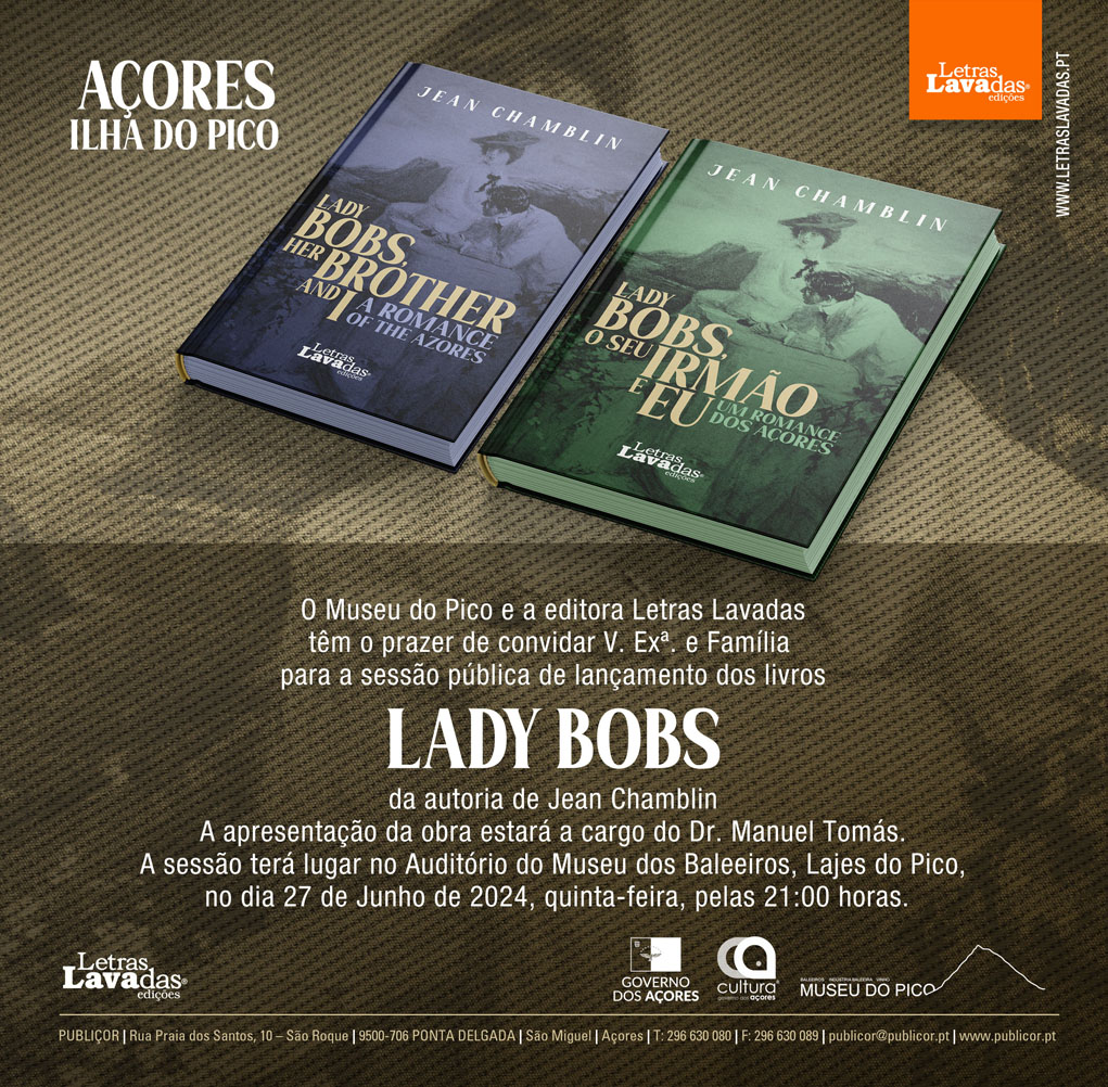 O Museu do Pico, em colaboração com a editora Letras Lavadas, apresenta na próxima quinta-feira, dia 27 de junho, pelas 21h00 horas, no Auditório do Museu dos Baleeiros, a obra “Lady Bobs, o seu irmão e eu: Um Romance dos Açores”, da norte-americana Jean Chamblin, pela primeira vez traduzido para português por Manuel Menezes de Sequeira.