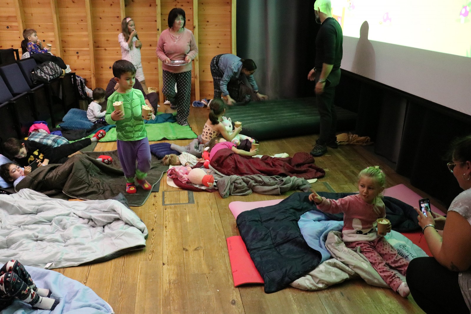 Uma ceia aconchegante e as pipocas fizeram as delícias de todos, que se vestiram a rigor, usando o seu pijama.