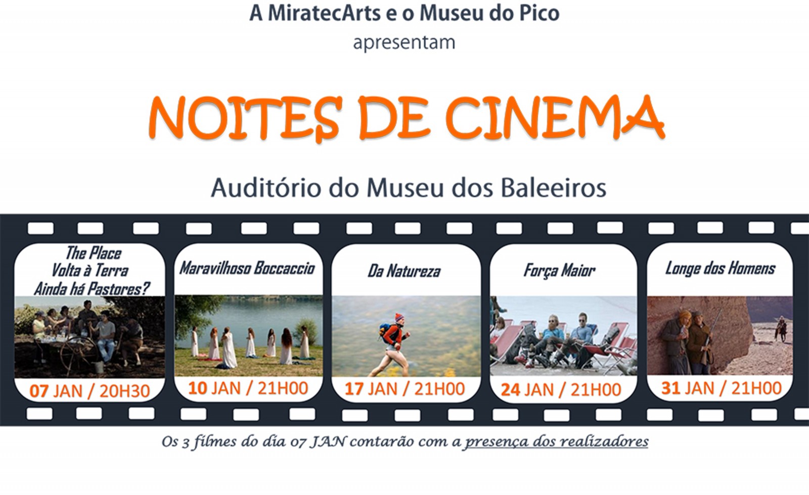 O Auditório do Museu dos Baleeiros será palco de Noites de Cinema, com entrada gratuita. A primeira no dia 7 de janeiro, pelas 20:30h, com a presença de dois cineastas portugueses: Jorge Pelicano e João Pedro Plácido. Os seus trabalhos mostram comunidades de montanha em Portugal. Os filmes de abertura "Ainda há Pastores?" e "Volta à Terra" foram produzidos em décadas diferentes, mas os seus paralelos ajudam-nos a compreender melhor o facto de comunidades montanhosas estarem a desaparecer, mesmo em Portugal. Para abrir a noite, a cineasta polaca Julia Poplawska, também presente, vem mostrar o seu último trabalho, a curta "O Local".
