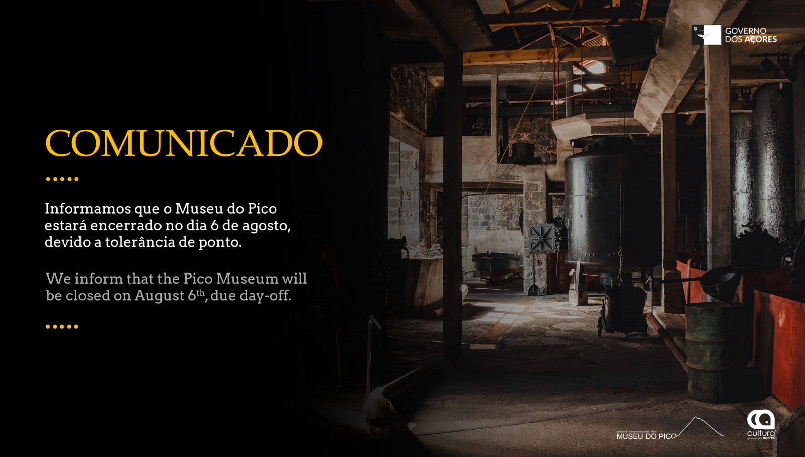 Informamos que o Museu do Pico estará encerrado no dia 6 de agosto, devido a tolerância de ponto.