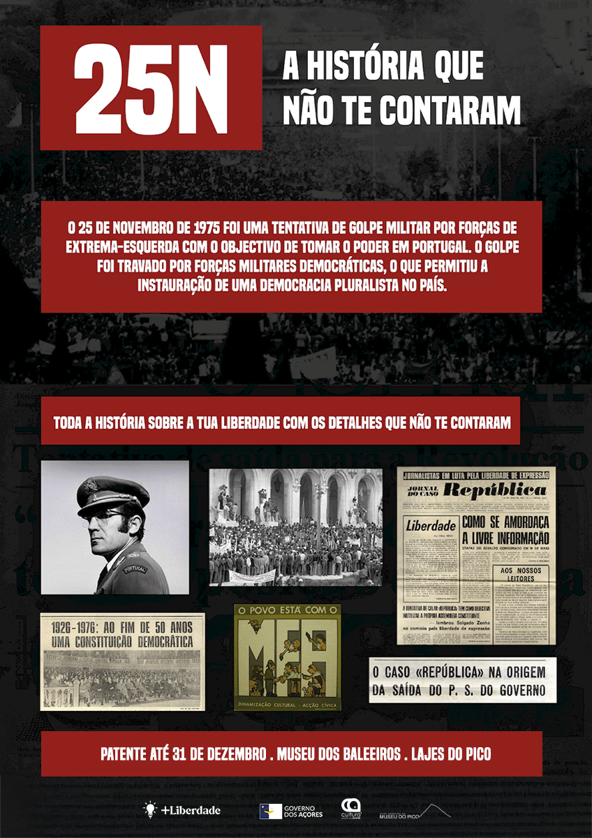 Assim sendo, e com base no mote “Continuo sem saber tudo o que aconteceu no 25 de novembro”, a Escola Básica e Secundária das Lajes do Pico, que rececionou e exibiu o ano passado a exposição “25N”, disponibiliza ao Museu do Pico esta mostra, que estará patente na galeria do Museu dos Baleeiros, a fim de dar a conhecer o que aconteceu durante este período marcante da nossa história.