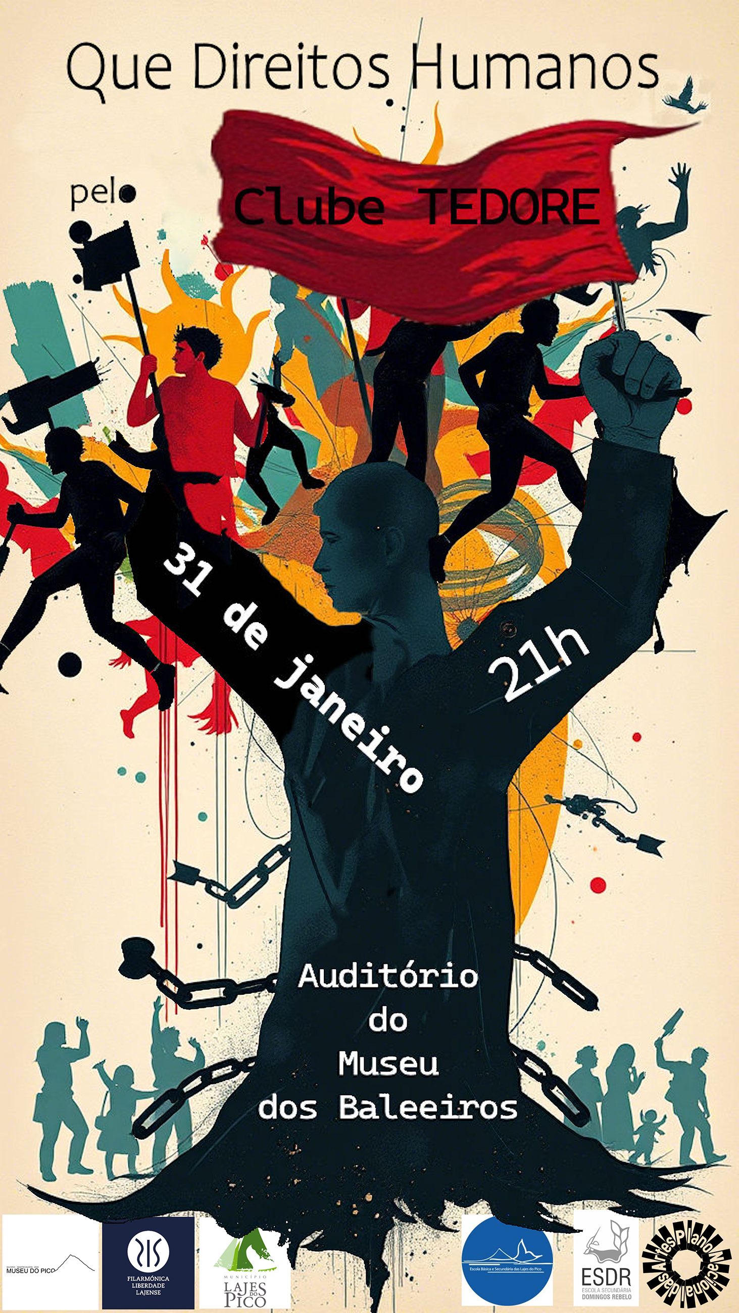 No próximo dia 31 de janeiro, o Clube de Teatro TEDORE, da Escola Secundária Domingos Rebelo, irá apresentar, no Auditório do Museu dos Baleeiros, pelas 21h00, a peça “Que Direitos Humanos”, um espetáculo que convida à reflexão sobre valores fundamentais da cidadania e da dignidade humana.
