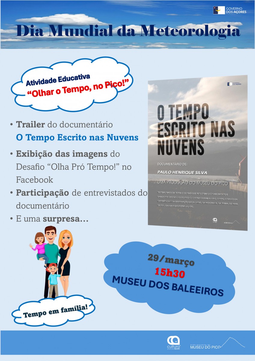 Neste dia em que celebramos a meteorologia, veremos o trailer do documentário O Tempo Escrito nas Nuvens, e as imagens do desafio “Olha Pró Pico” lançado no Facebook para os mais pequenos e família. Contaremos com a presença de participantes no documentário que irão partilhar a sua experiência. E no fim, uma surpresa para os mais novos.