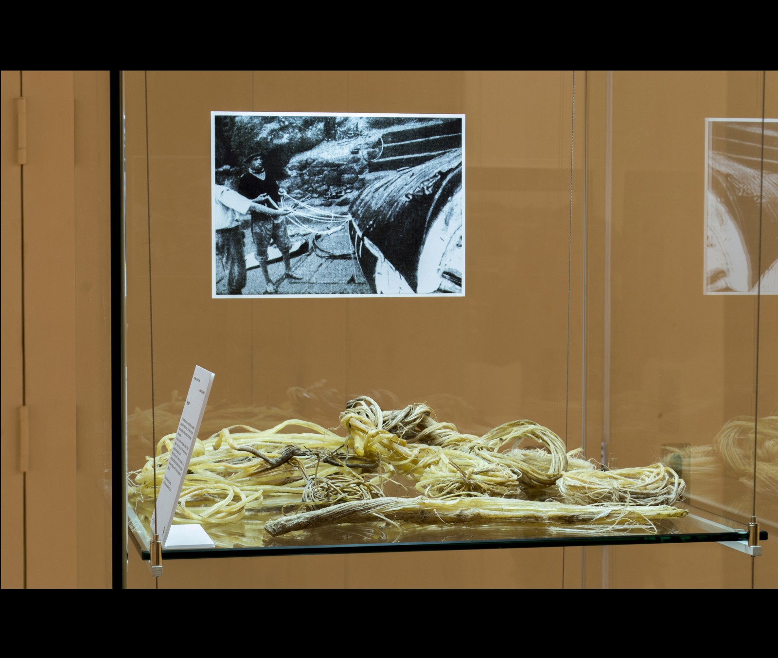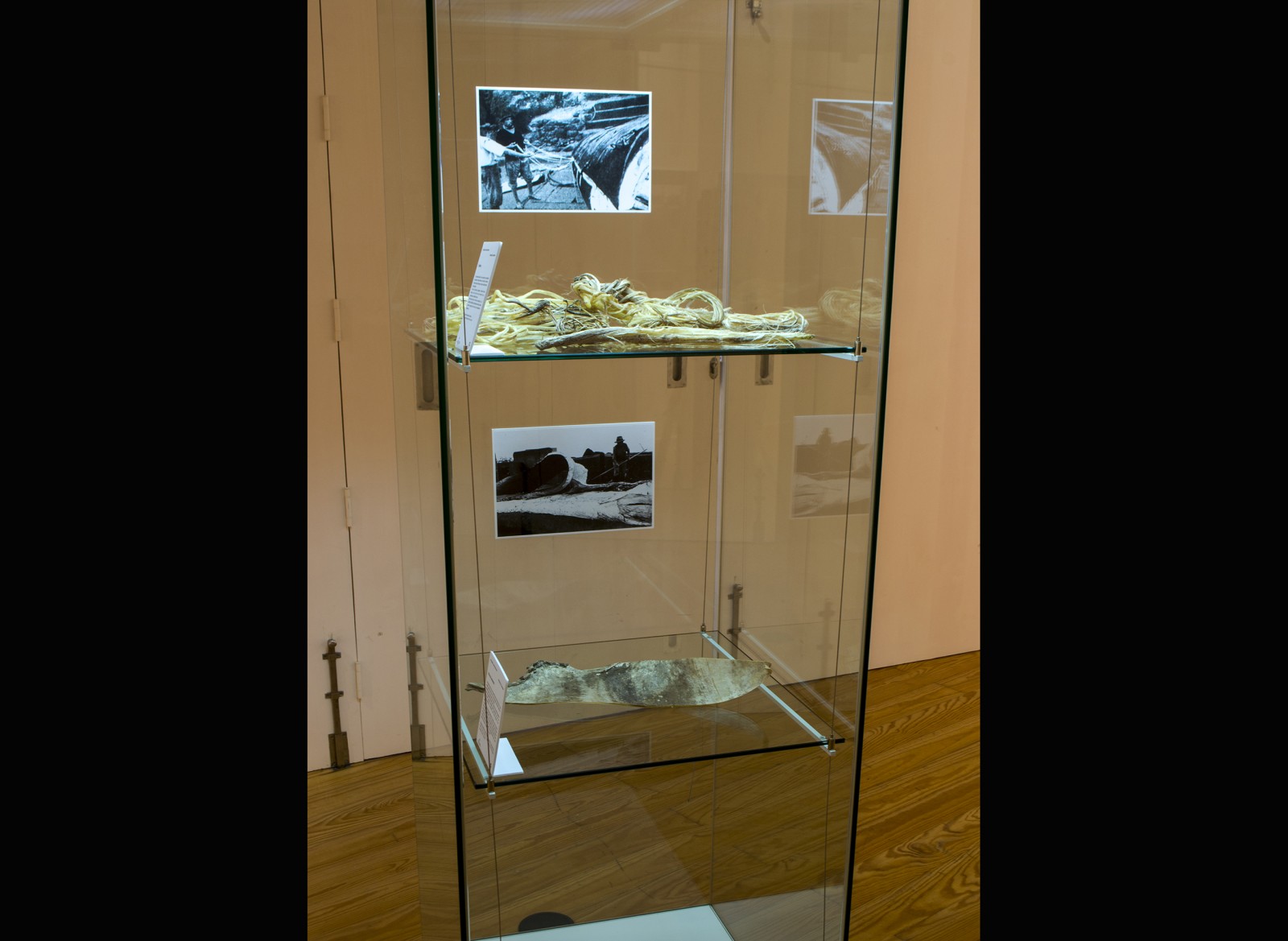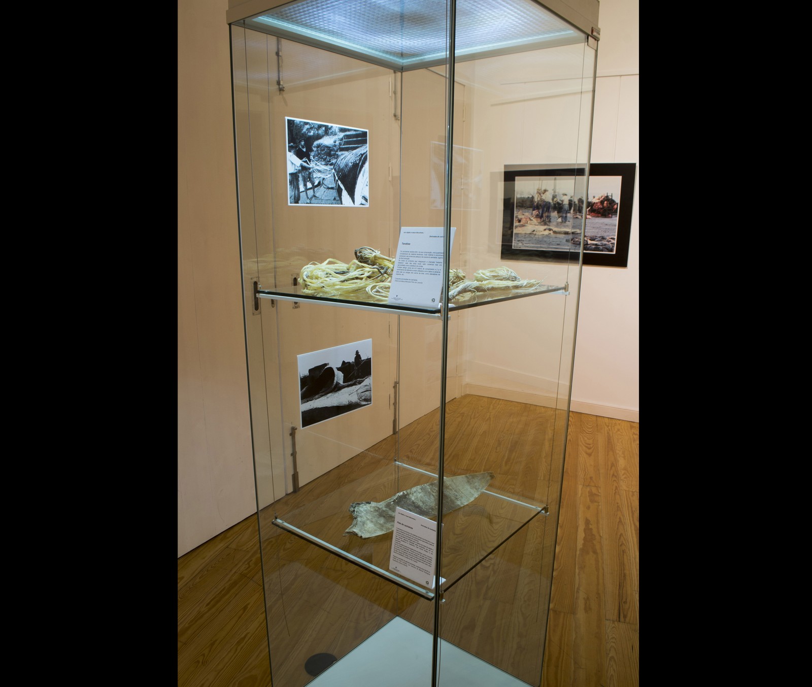Em exposição encontram-se um conjunto de tendões e uma amostra de pele de cachalote.