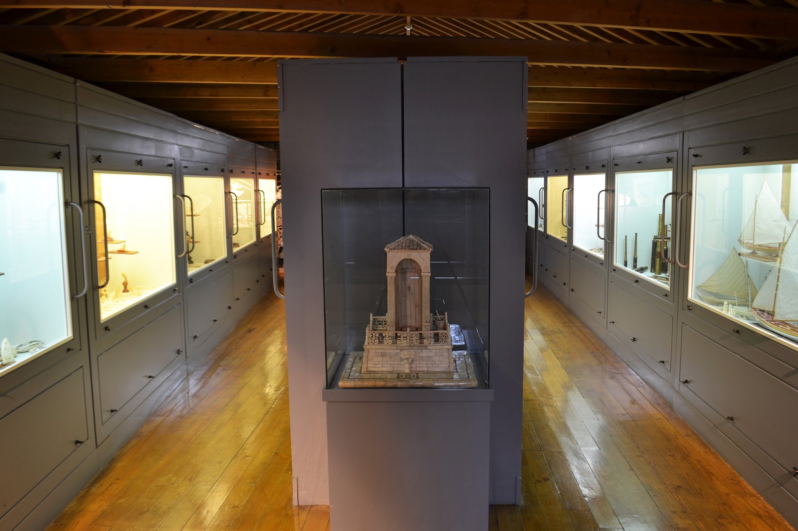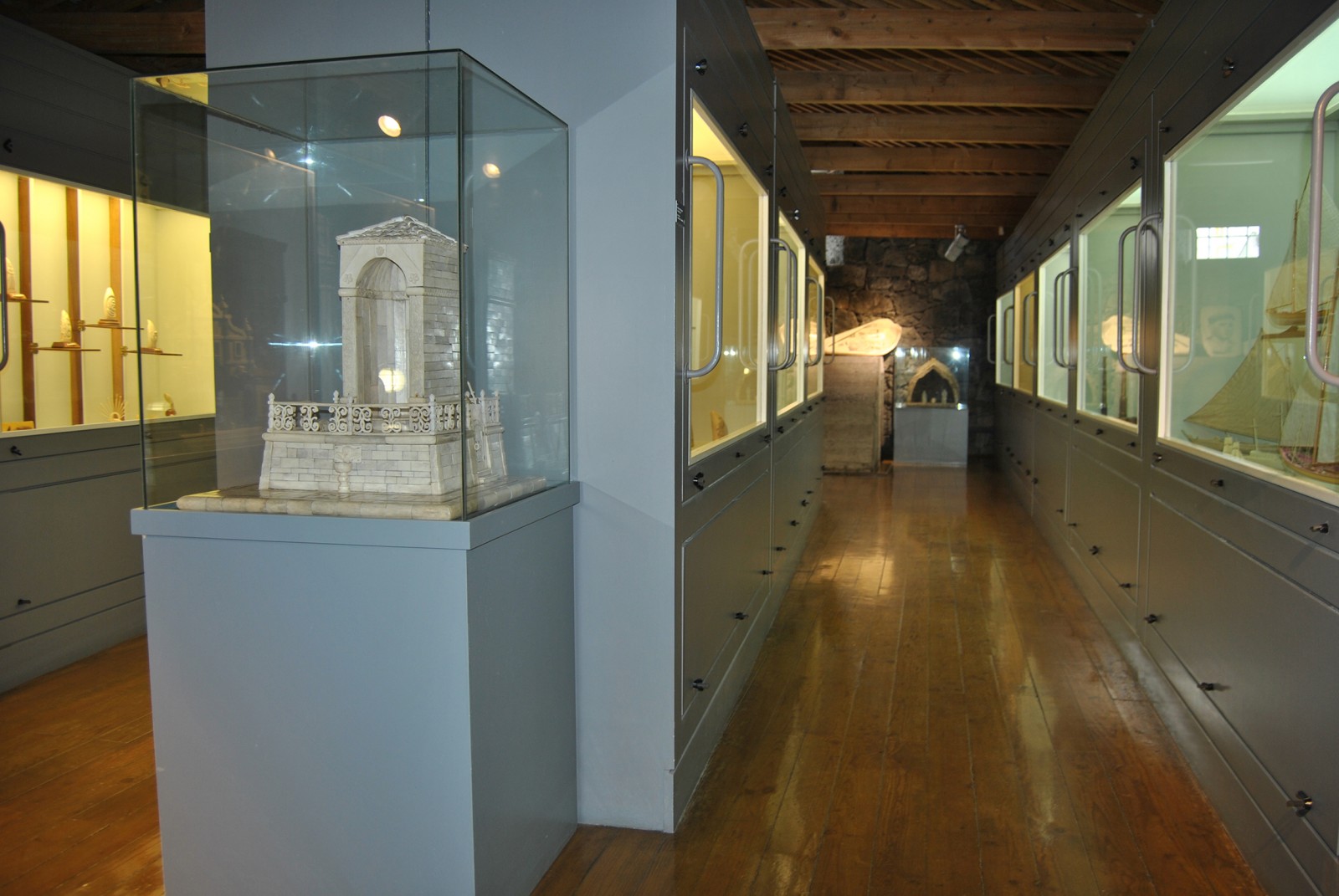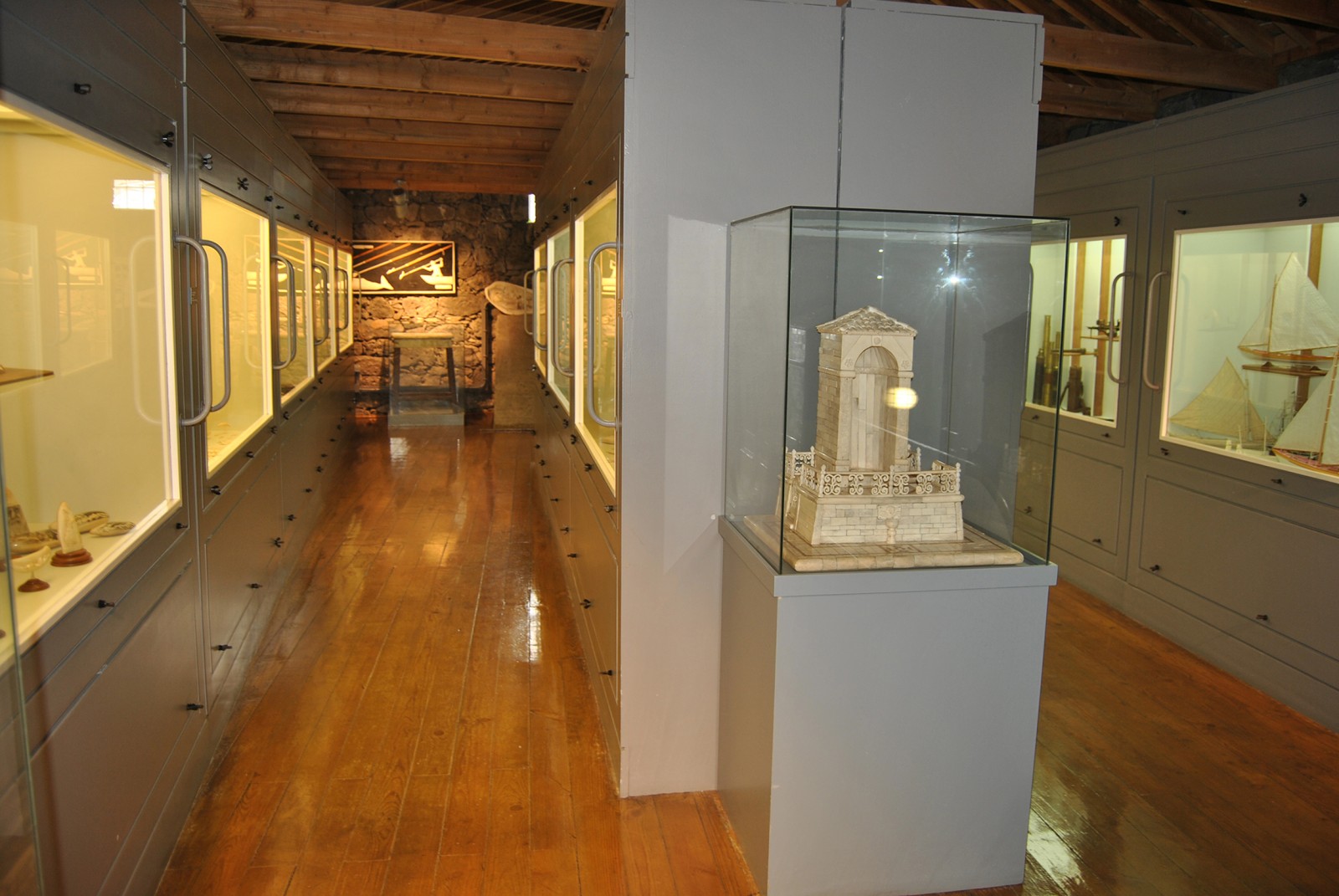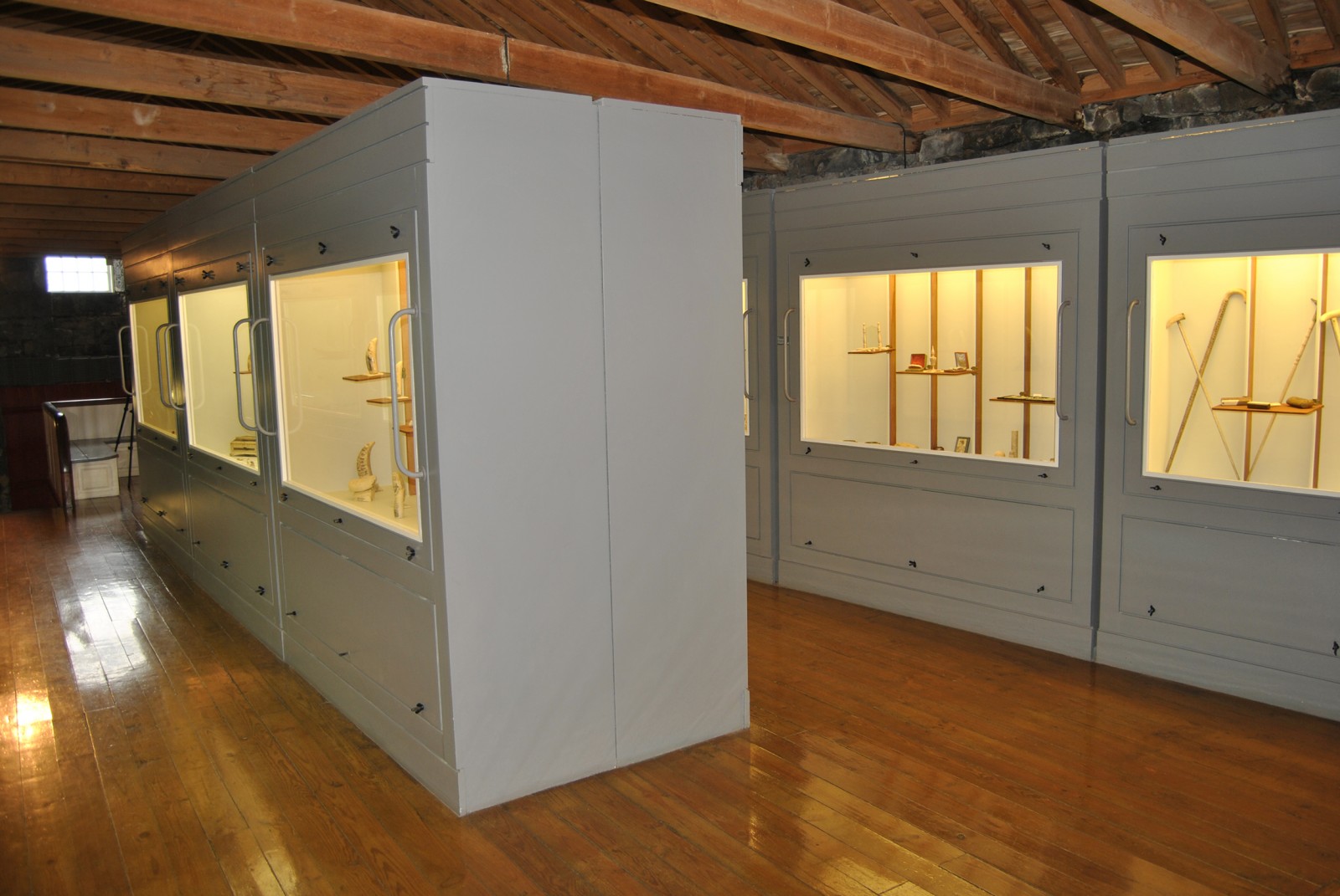 Durante a baleação anglo-americana, de longo curso, praticada em navios-fábrica, o artesanato de bordo – scrimshaw -, que constituía uma espécie de “terapia ocupacional”, materializou-se em peças decorativas e de culto. Com a baleação sedentária e estacional nas ilhas, o osso mandibular e o marfim de cachalote passaram a fazer parte do quotidiano das gentes, como matéria-prima para o fabrico de artefactos de cariz utilitário e decorativo. Neste núcleo é apresentado um numeroso e diversificado conjunto de trabalhos em osso e marfim de cachalote, de autores como Fátima Madruga, Frank Barcelos, José Eduardo Silva, Camilo Costa, Manuel Gonçalves, Francisco Barreto, José Barreto, entre outros. Destacam-se as coleções Jacob Tomás, João Flores e Gualter Barreto.